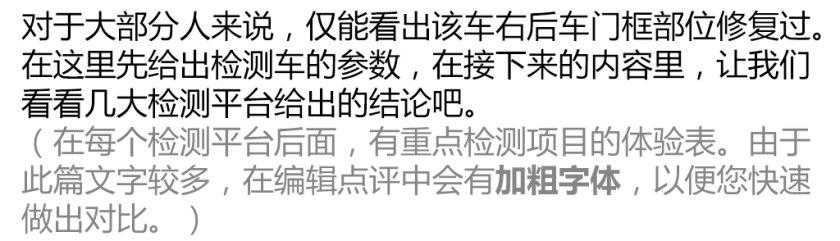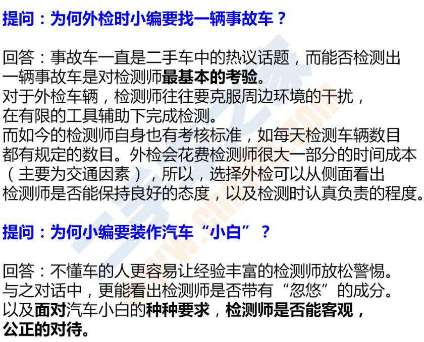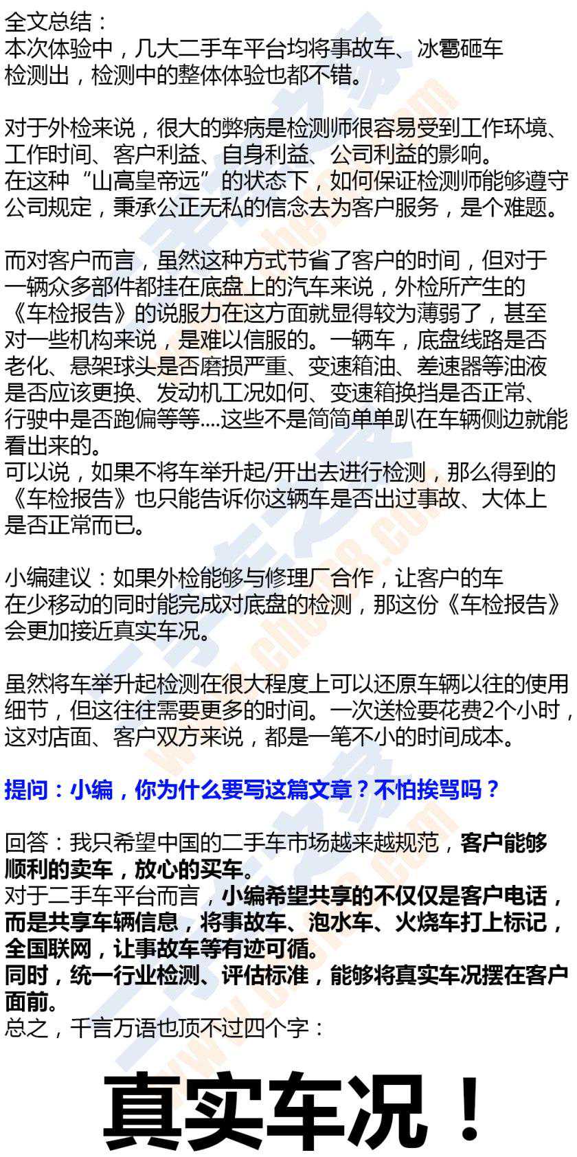 [二手车之家行业资讯]二手车市场鱼龙混杂,众多二手车平台的加入确实让车况愈加透明。但不可否认的是,一家一个检测标准,一家一个流程。今天,我们就来体验下国内几家二手车平台的检测业务。看看几家二手车平台检测业务的体验是什么样儿的。检测业务分为外检与到店检测。外检就是客户不用动车,检测师上门检测。而到店检测就是客户需要将车开到平台指定的门店进行检测。而此次体验中,小编特意请来了事故车,看看几大平台是否能够通过挑战,还原真实车况呢?让我们拭目以待吧。(此篇文章大部分图片处于非正常拍摄情况,图片质量不佳,望见谅。)