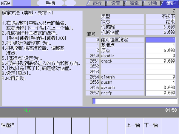 此时Z轴绝对位置设定完成,状态显示结束,机械位置为原点设定值。