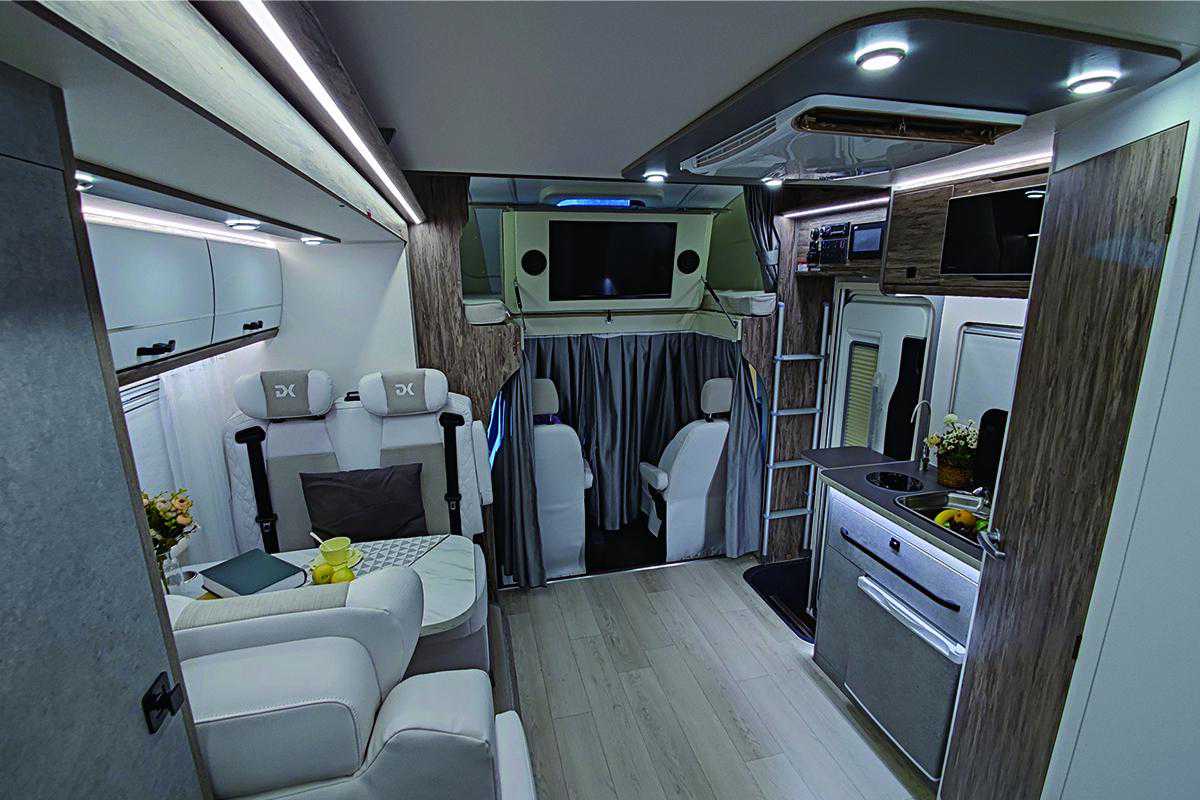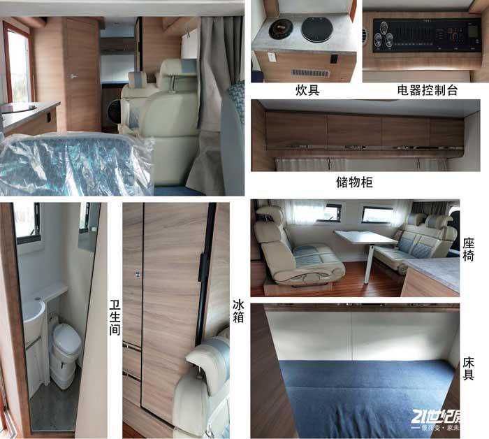地板采用E0级环保游艇多层板材质,体现了典雅、环保及无异味等特点,为用户提供了一个良好的居住氛围;从前往后顺序依次为额头床+会客区+厨房区及卫生间+车尾横置拓展床的布局结构设计。额头床翻折起来是一台32寸12V智能电视;布艺窗帘也可保证车内的隐私性。与之搭配的是独立蓝牙音响等设备,为车内成员提供不错的观感体验。