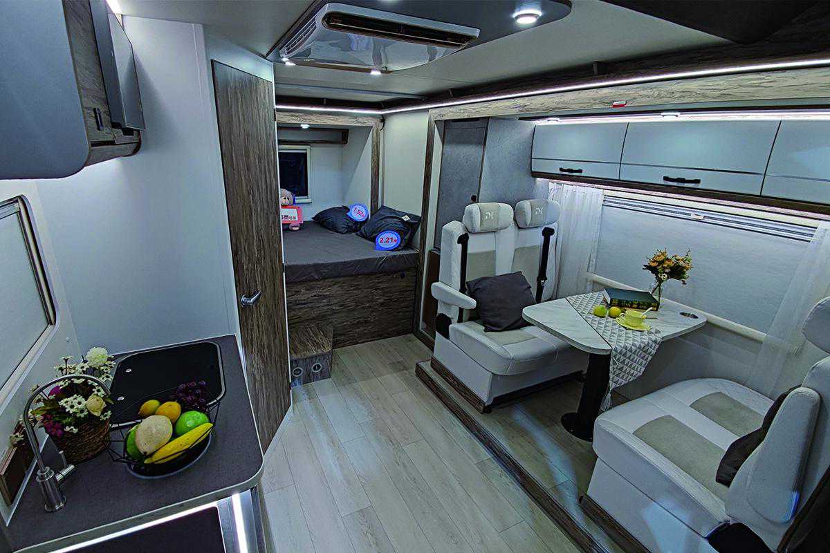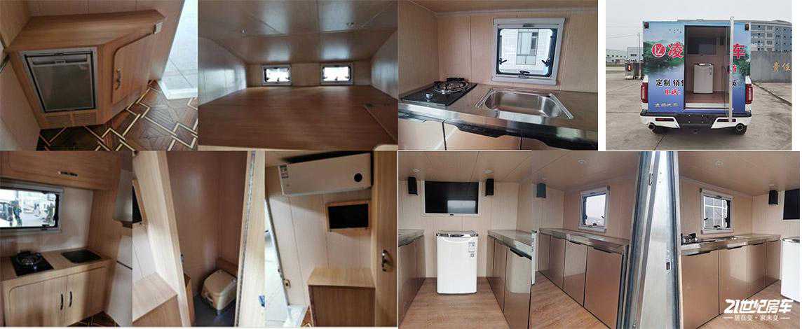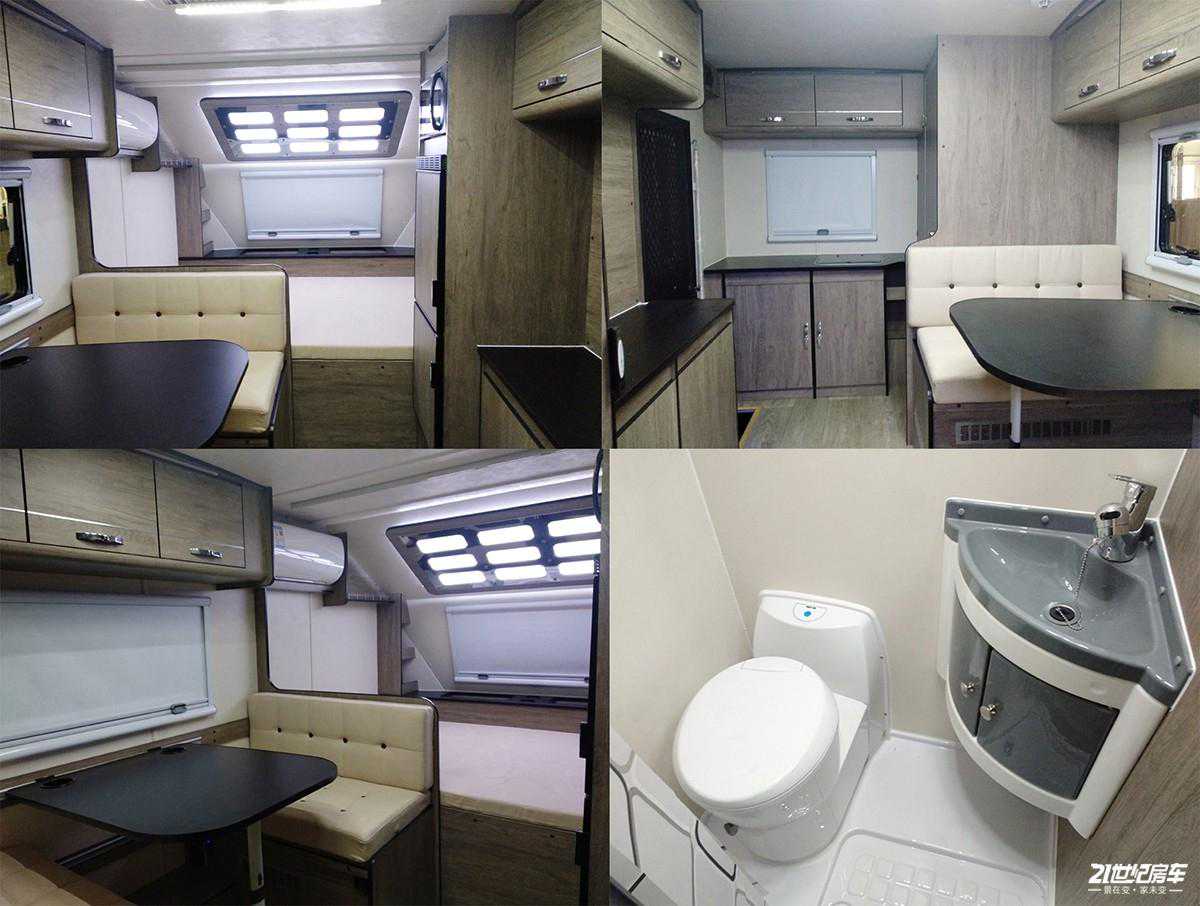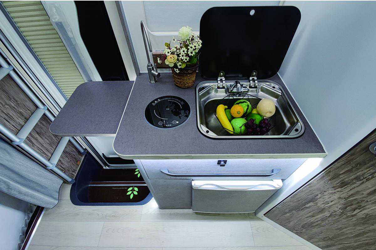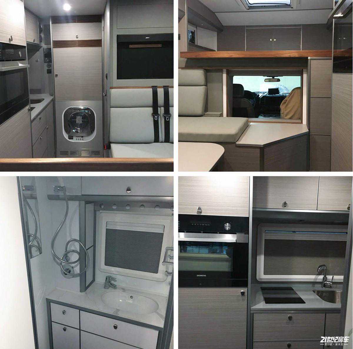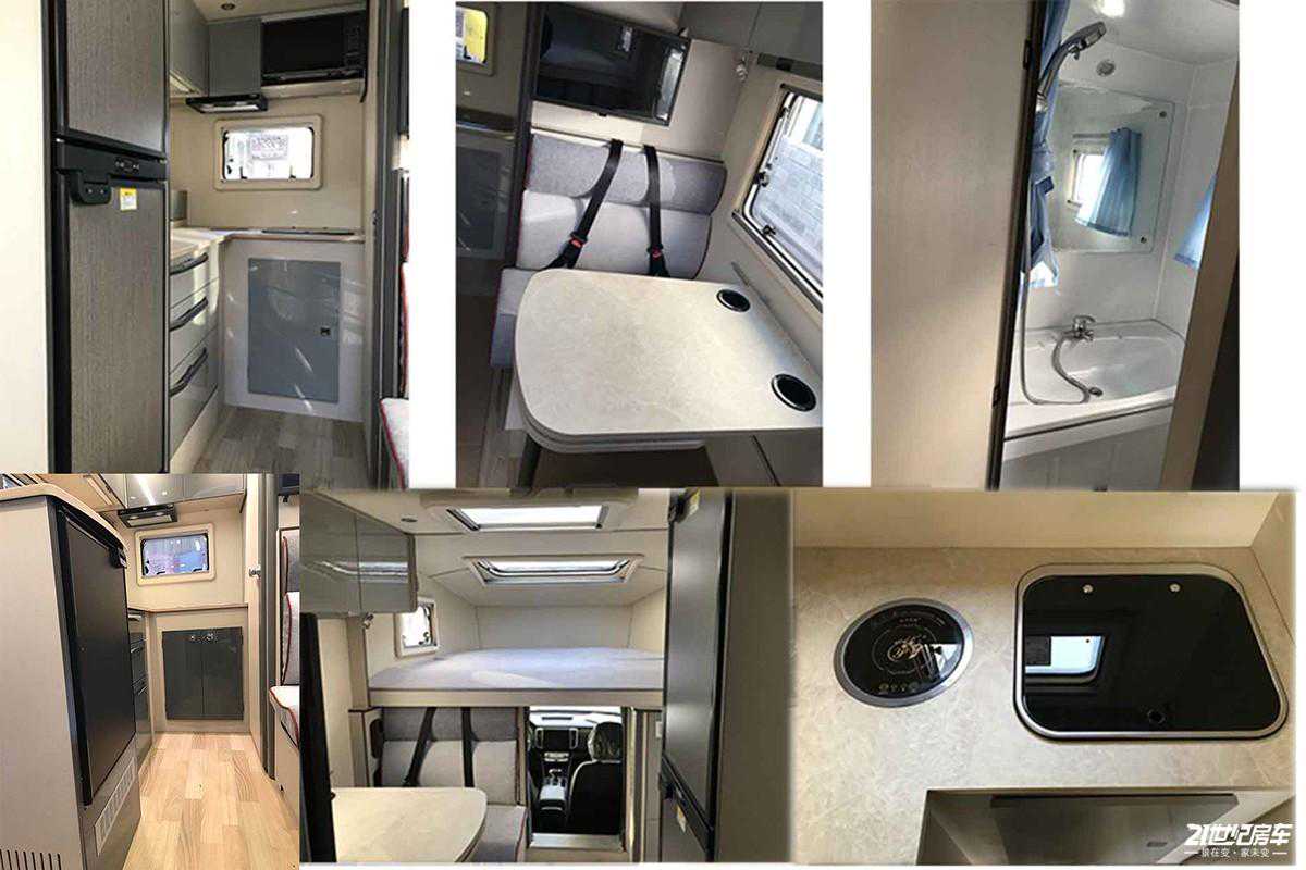 厨房区位于车厢中部,配有带盖式不锈钢水槽+水龙头、尚朋堂电磁炉及美的微波炉;周围220V电源插座可随时为手机等小型电器进行充电。集成控制面板采用触控屏设计,位于乘客门上方,可控制车内照明及各个电器开关等。其它方面包括一氧化碳/烟雾报警器、直饮水系统、格力顶置变频空调及5kW燃油暖风热水一体机等。