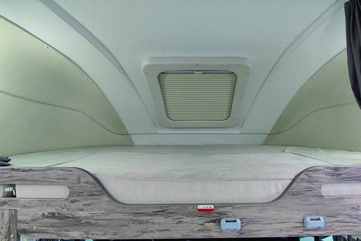 驾驶室上方额头双人床的设计,能满足两名成年人休息;弧形天窗可保证充足的采光及通风换气效果。