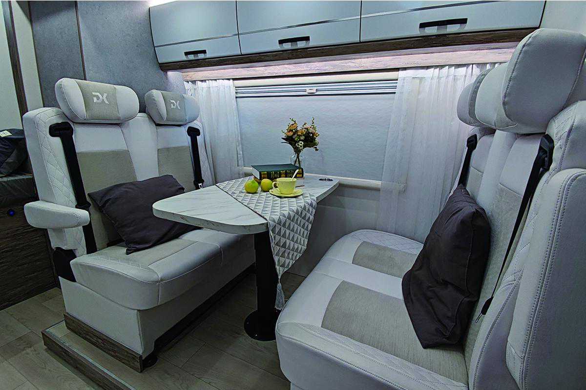 休闲会客区采用双人对坐式卡座沙发+升降桌+冷藏冰箱/冰柜布局设计,卡座沙发搭配折叠式餐桌(可升降)临时拼成一张沙发床;此外卡座沙发配备四条固定式安全带,在行驶的途中可以更好的保护车内乘客的人身安全。沙发内侧墙壁上有外推窗,提供采光及通风换气效果;推窗上方配有吊柜,方便日常使用。卡座后方配有70L沧浪冷藏冰箱+50L沧浪冷冻柜的组合形式,冷藏冷冻都可以,可以防止旅途中食物的变质。