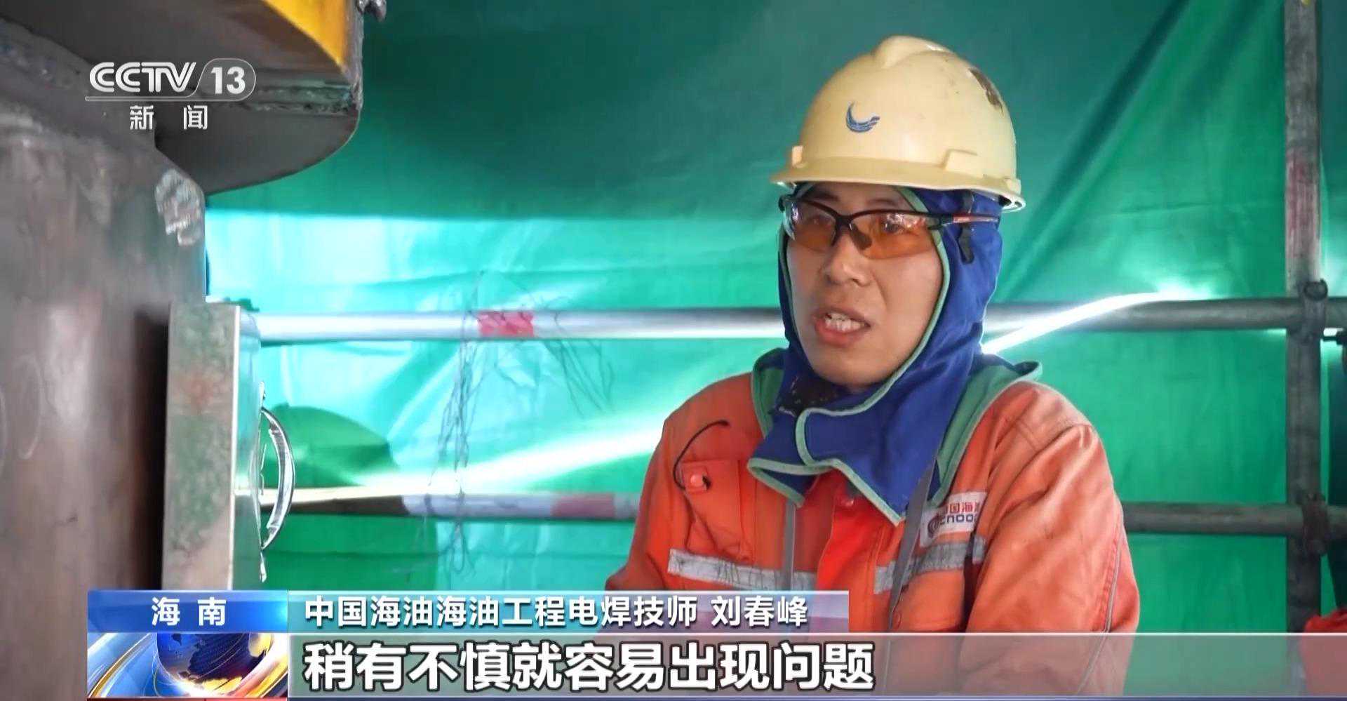 中国海油海油工程电焊技师刘春峰:海上风力和湿度都比较大,焊接空间非常狭窄,操作难度很大,稍有不慎就容易出问题,非常考验我们的焊接技术。