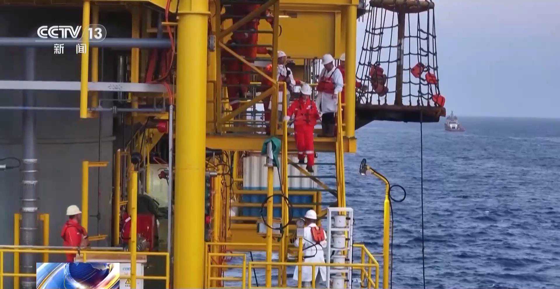 总台央视记者张丛婧:平台还在安装中,需要乘坐“吊笼”才能上去,这也是海上非常独特的一种交通工具。