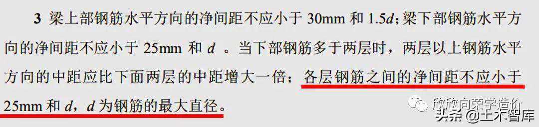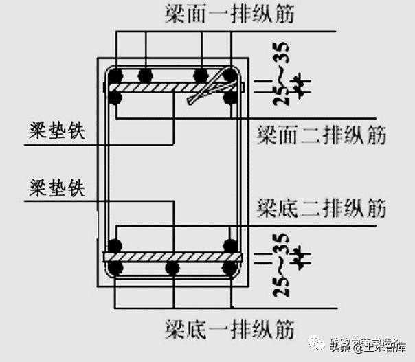梁垫铁的钢筋不应小于25mm和d,d是两排钢筋中最大直径。
