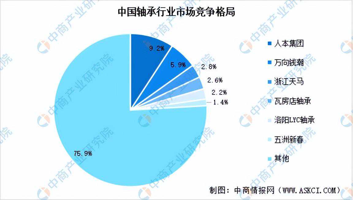 从竞争格局来看,我国轴承市场中,斯凯孚(SKF)、舍弗勒(Schaeffler)、恩斯克(NSK)、捷太格特(JTEKT)、恩梯恩(NTN)、铁姆肯(TIMKEN)、日本美蓓亚(NMB)、不二越(NACHI)八大国际轴承企业占据主导地位,且主要集中于高端市场。本土轴承企业规模普遍不大,行业集中度低,人本集团、万向钱潮、浙江天马、瓦房店轴承、洛阳LYC轴承、五洲新春六家企业合计占比24.10%。