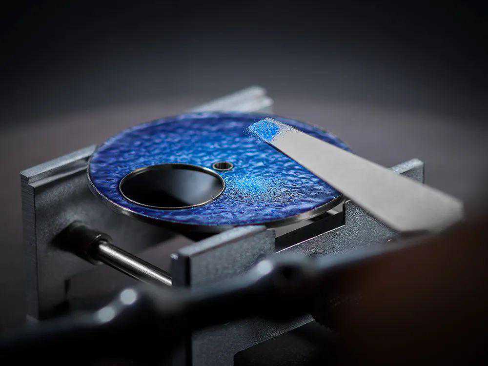 新意交给布局方式,那家族化的特征就交给了盘面质地和用料。锤纹质地、大明火珐琅烟熏处理、用创新陶瓷基底材质Globolight®嵌入的方式带来夜光,各处都是构成疾速者基因的标志元素。特别是盘面的锤击效果,看图片的话,与其说是“锤击”,更像是靛蓝的湖水泛起微漾,和“AquaBlue水蓝色”绝配。或许这就是亨利慕时锤击盘的至高表现,今后再做绿盘、三文鱼,偏爱这些颜色的用户会得到满足,但从整体概念上说,小三针头炮很难超越。