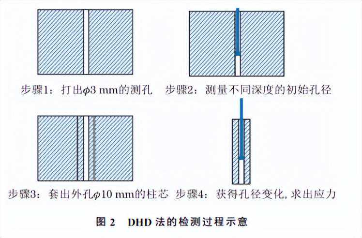 通过准确测量出测孔在套孔前(见图2步骤2)后(见图2步骤4)的直径变化,可以计算出残余应力的大小。作者在进行DHD法检测残余应力时,采用内径测量仪和电火花(ElectricalDischargeMachining,EDM)切割技术。