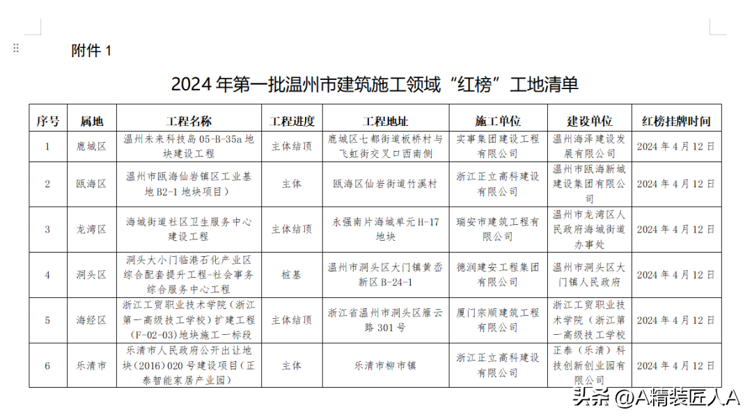 日前,温州市住建局发布《关于公布2024年第一批温州市建筑施工领域“红黑榜”工地情况的通知》。