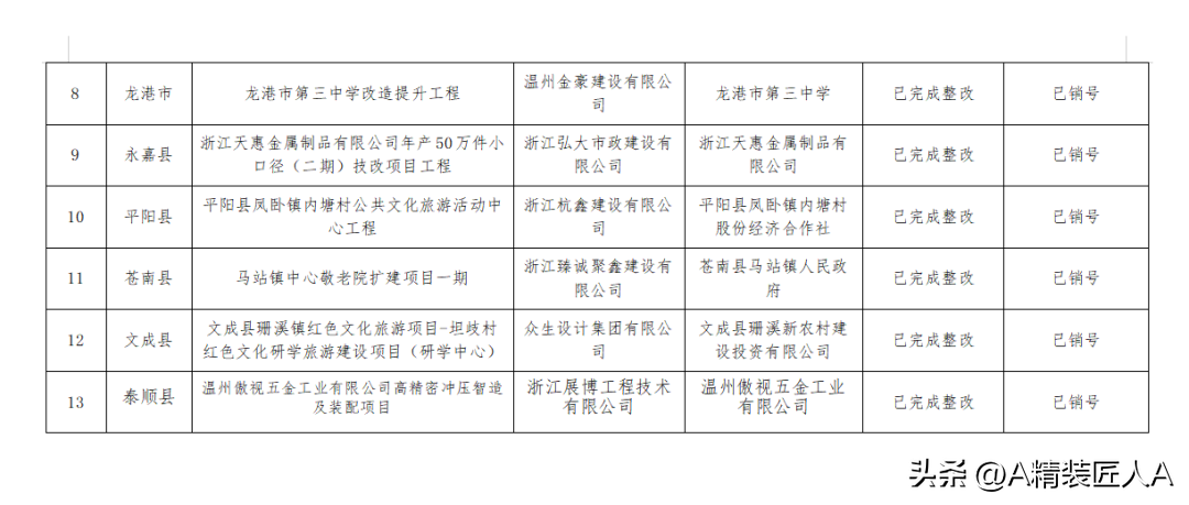 经各地住建部门复查,温州市鹿城区洪殿单元C-18地块建设项目等13个“黑榜”工地已完成整改,现予以摘牌销号(名单详见附件3)。