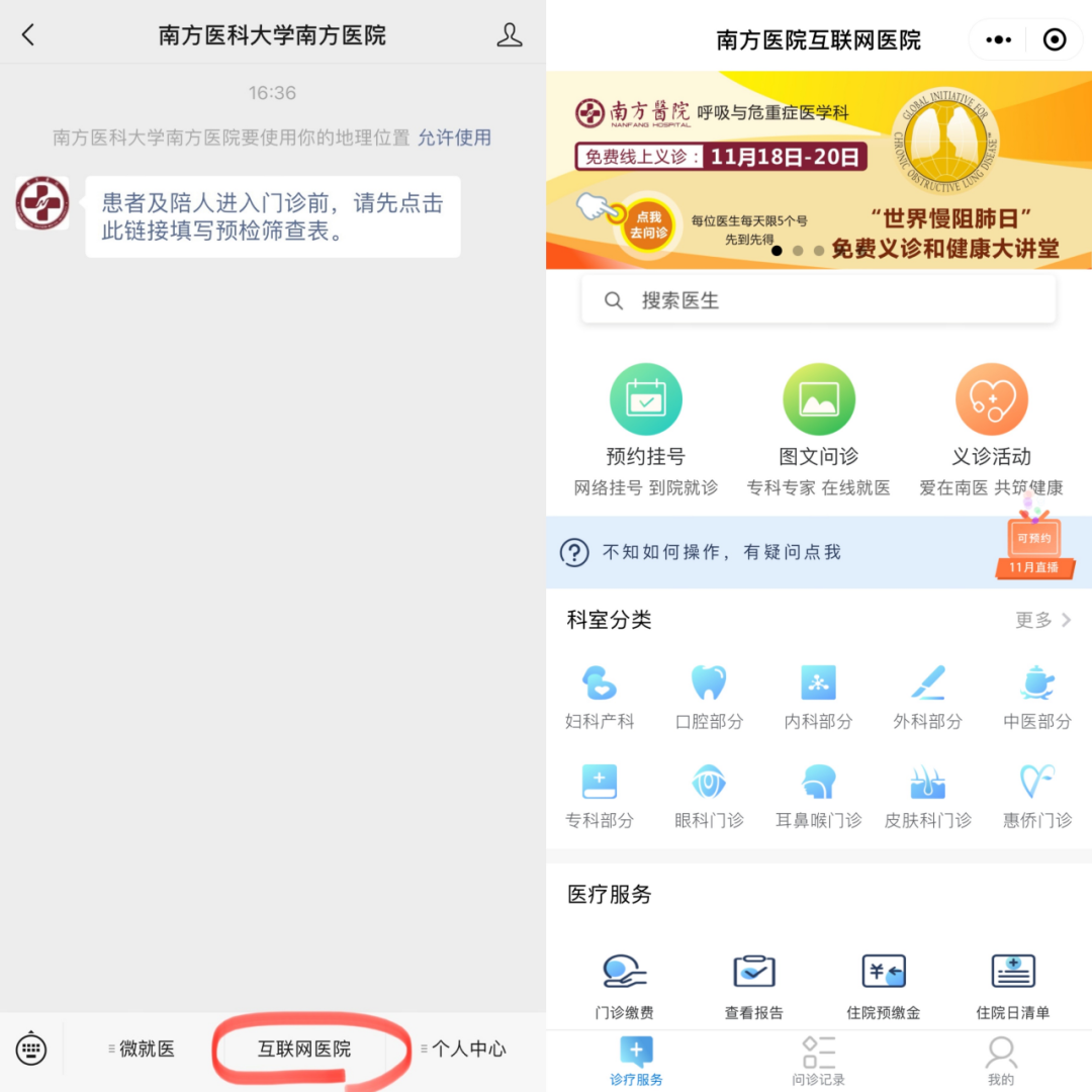 ①快速访问→挂号/门诊缴费/报告查询/加号支付/网上续药问诊