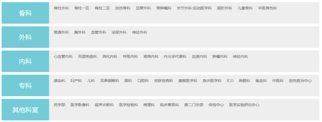 内分泌科、普通外科、泌尿外科、中医肝病科、感染病科、风湿免疫科、临床护理、血液内科、神经外科、骨科、神经内科、急诊科、检验科、耳鼻喉科、产科、麻醉科、康复科、病理科、口腔科、皮肤科、肾内科、儿科、消化内科、医学影像科、感染病科、临床护理、呼吸内科、普通外科、泌尿外科、中医肝病科、风湿免疫科、内分泌科等。