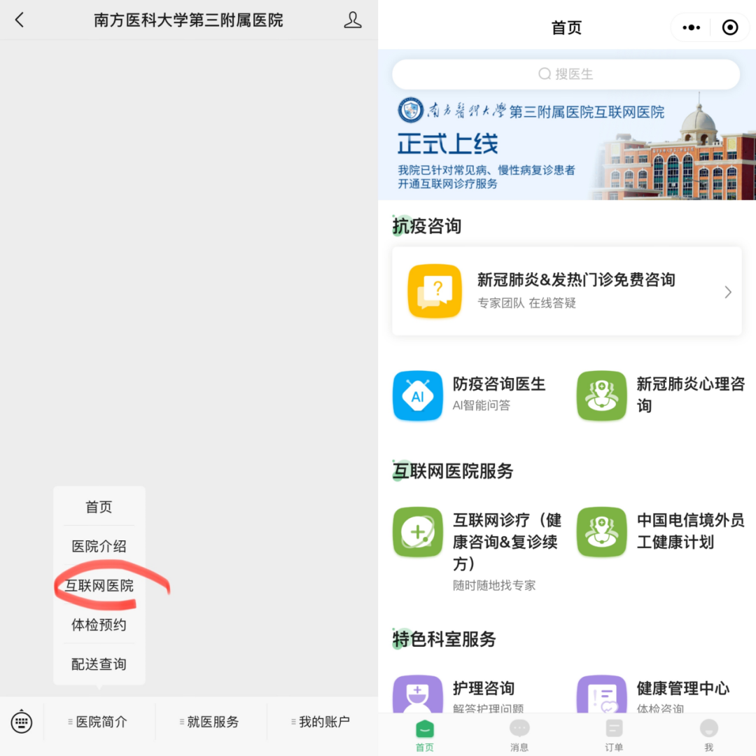 ②互联网医院→互联网医院/新型冠状病毒肺炎/发热门诊导航地图/医疗运转/微官网