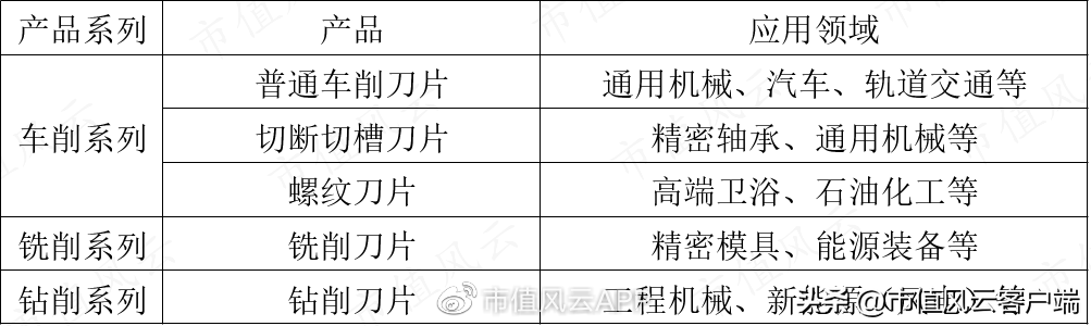 现有核心产品主要为硬质合金数控刀片,包括车削、铣削和钻削三大系列。各类产品主要应用领域如下表所示: