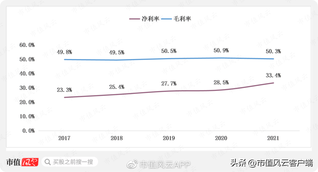 近几年毛利率整体稳定在50%左右,处在相对较高水平。2021年毛利率下滑主要系原材料价格持续上涨,导致单位成本上升;净利率逐年提升,2021年净利率为33.4%,盈利能力较强。