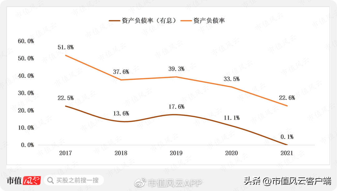 近几年资产负债率逐年下降,2021年有息负债降至极低水平。