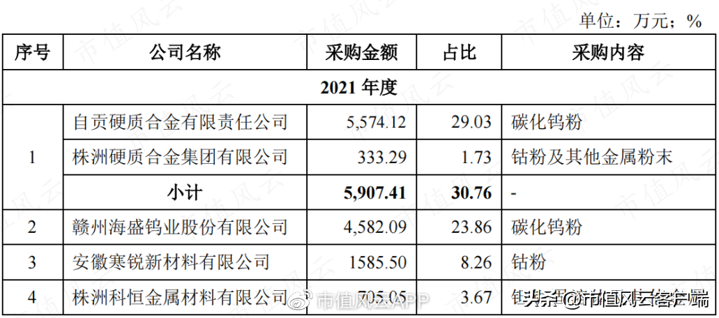 上游方面,2021年前五名供应商采购额占年度采购总额68.63%,核心原材料碳化钨粉的主要供应商为中钨高新旗下子公司,而主要竞争对手之一的株洲钻石也是中钨高新的二级子公司。