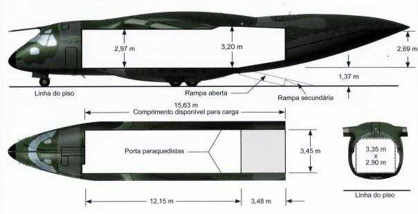 由于中央翼盒侵占了货舱空间,所以货舱高度从机尾的3.2米降低到了翼根的2.95米,货舱其余部分不受结构限制。货舱长12.7米,算如尾部坡道的话是18.5米,宽3.45米。