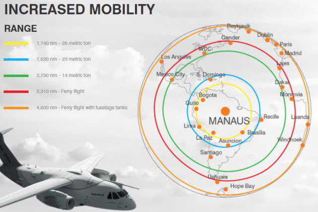 在载重23吨时,KC-390的航程为2815公里,空载转场航程为6130公里。举个例子,KC-390能够运输23吨货物从日内瓦起飞,然后降落在英国或爱尔兰共和国的任何地方,在装载14吨货物时,则能飞到塞内加尔的达喀尔或阿曼的马斯喀特。