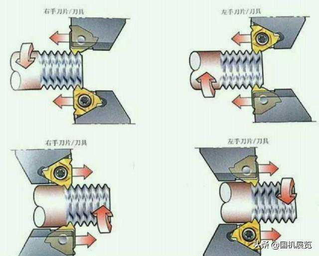 关于左右旋螺纹的加工方法如下如所示,最简单的一把刀就是从右往左为右旋,反之左旋!