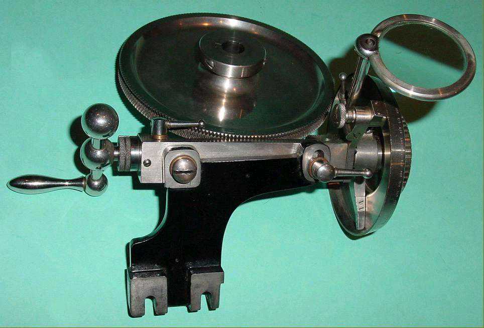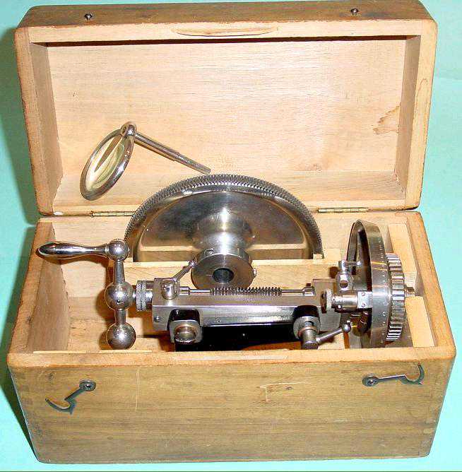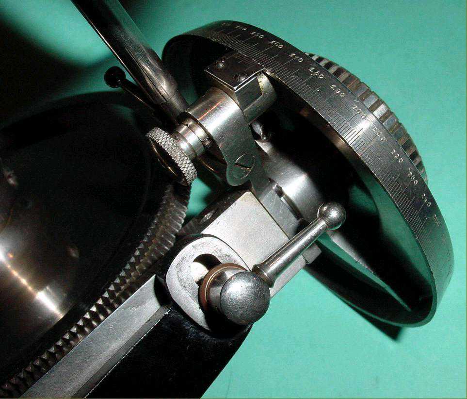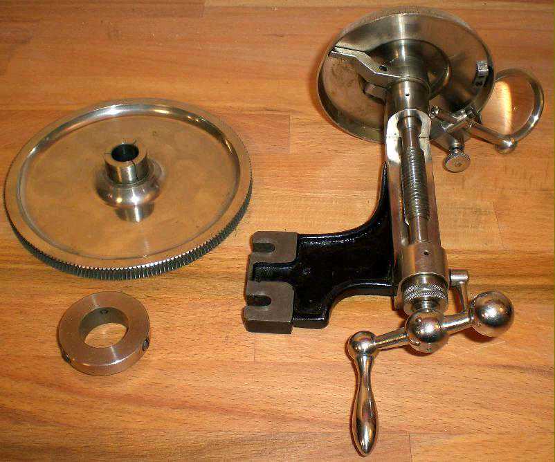 该单元由位于车床主轴上的蜗轮及其在摩擦离合器上的分隔板组成。蜗轮有200齿,刻度环为500标记-因此,车床主轴转动一圈即可使蜗杆旋转200圈,因此在分隔环上有(200x500=10000)10000标记。例如,要切割83个齿轮,必须计算200/83的比率,精度为小数点后4位,得出2.4096。这是2整圈加4096/10000圈。由于除法环只有500个除法标记,因此必须将小数部分除以2。现在,您在刻度环上有2个完整的回合和204.8的标记。为了帮助重复复位,在分隔环下方提供了一个可调节的挡块。例如:要切成127齿的齿轮:200/127=1.5748。小数点后半部分减半,以使整整一圈,并在分隔板上给出287.4的标记。首先,将棘轮棘爪设置在位置3,并用放大镜将其精确调整至287.4,然后将棘爪锁定。接下来,在止动棘轮的位置1中,将分隔板设置为零,将蜗杆的固定螺钉锁定,并进行第一次切割。然后松开固定螺丝,将棘轮拨到位置2,然后将蜗杆主轴转动一次。然后将棘爪棘轮置于位置3,将蜗杆主轴旋转(额外的287,4标记)到挡块,将固定螺钉锁定以使挡块进入位置1,将分隔板变回零-然后将下一个切。对于不带小数部分的除法,只需要整圈蜗杆即可。1937年的价格为175马克-当时完整的带有复合滑架的LorchLL车床是170马克-这些单位很少售出,因此十分稀有。
