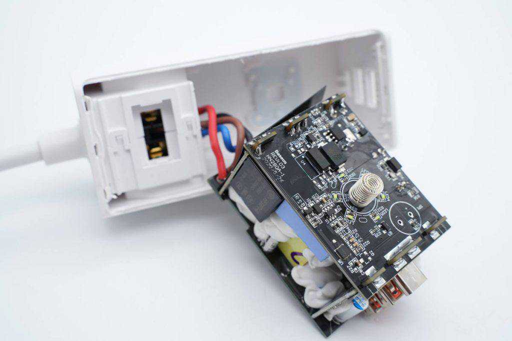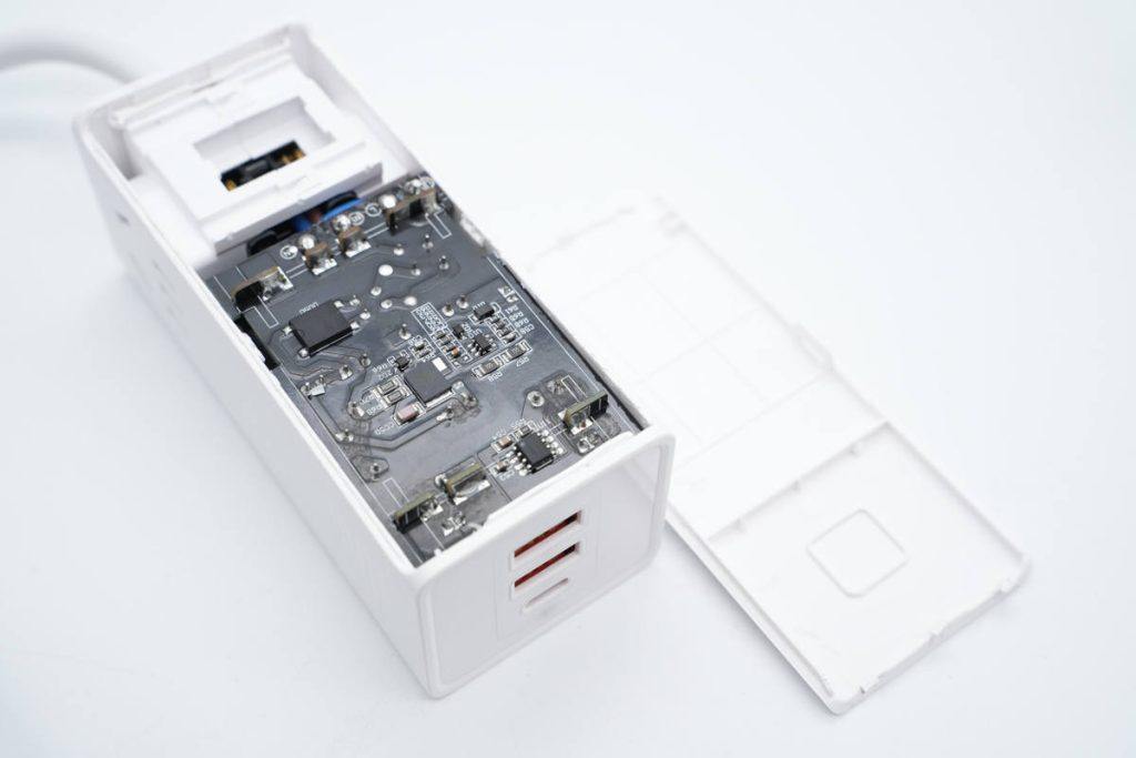 首先撬开插线板的外壳,内部是插座模块和快充模块,两者为独立结构。