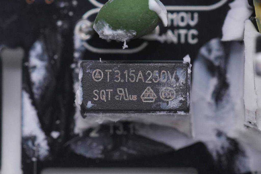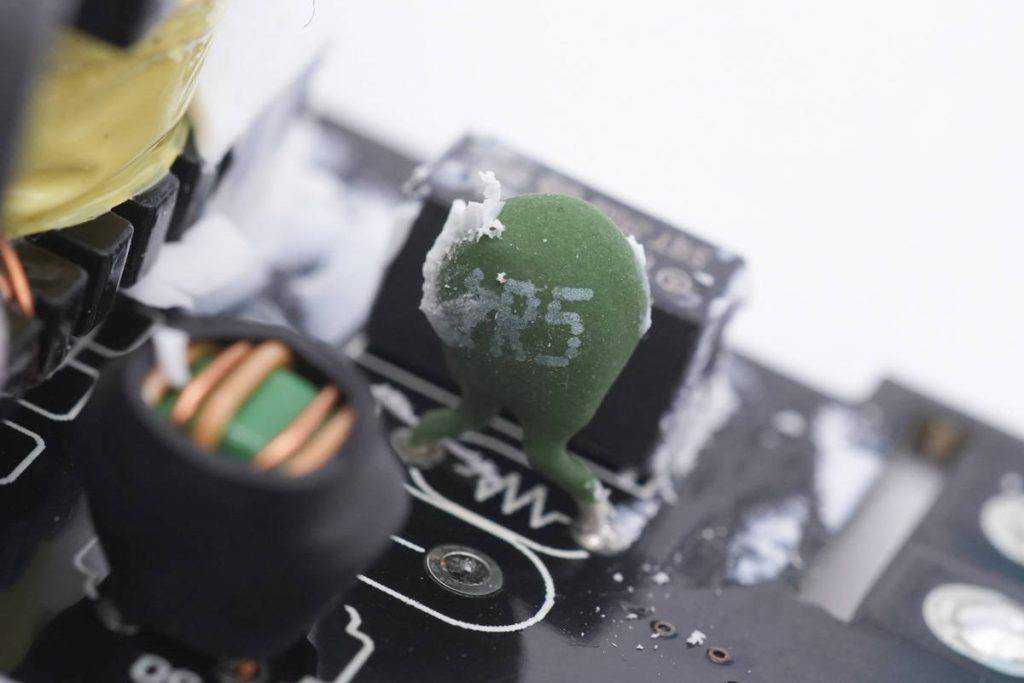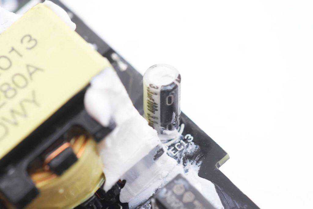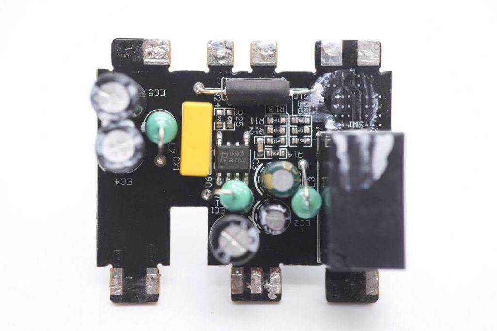 小板左侧为两颗输出滤波电容,右侧为开关变压器,底部焊接滤波电解电容,右侧焊接共模电感,NTC热敏电阻和输入保险丝。
