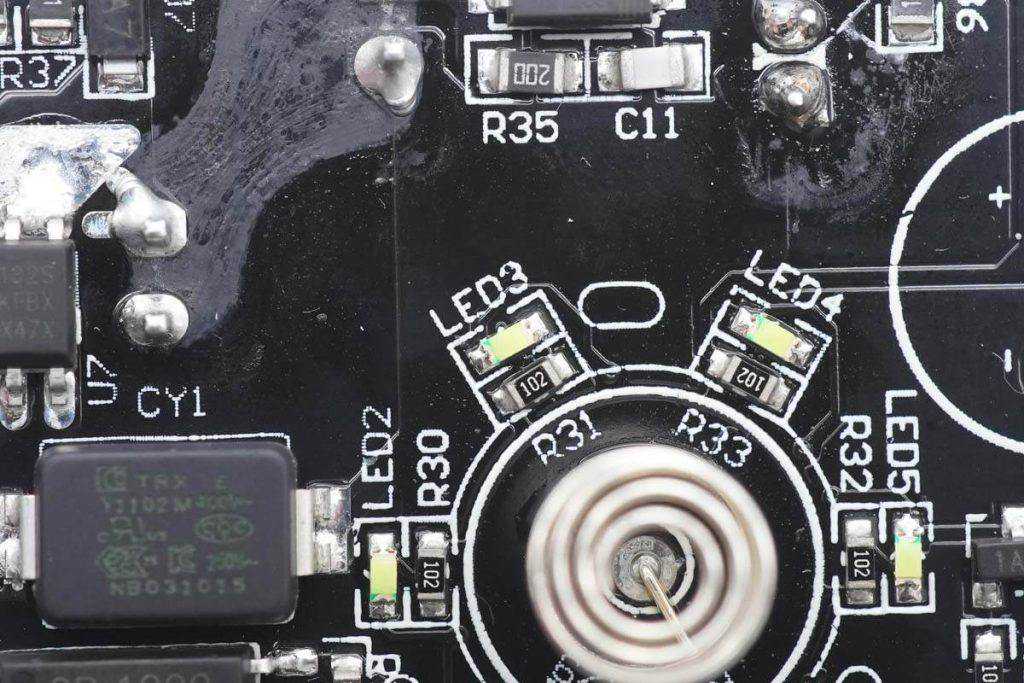 在触摸弹簧边缘是六颗LED指示灯,用于指示供电状态。