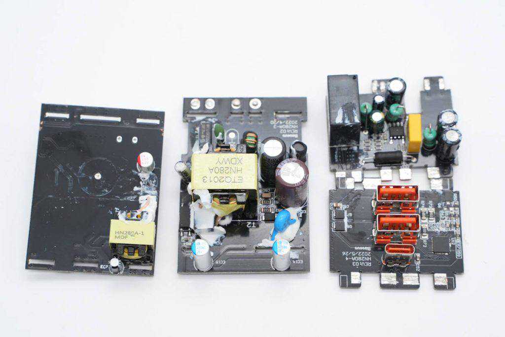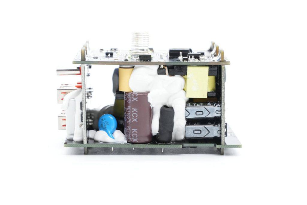 快充模块由四块PCB板焊接组成,其中对应插座模块的位置贴有麦拉片绝缘。