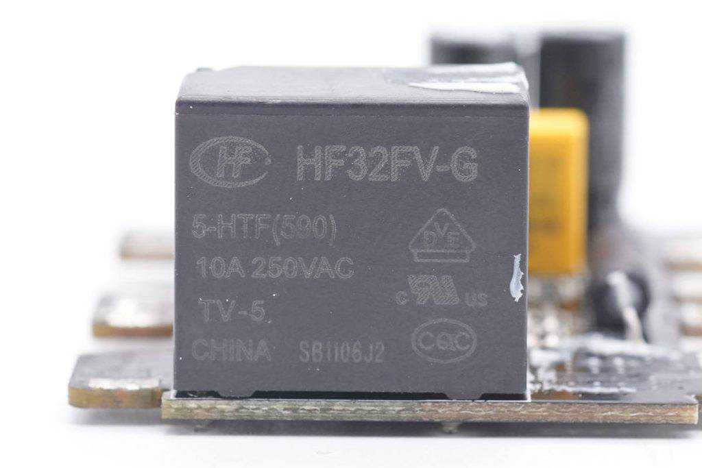 继电器来自宏发,型号HF32FV-G,触点电流10A,线圈电压5V,用于控制插座交流部分供电。