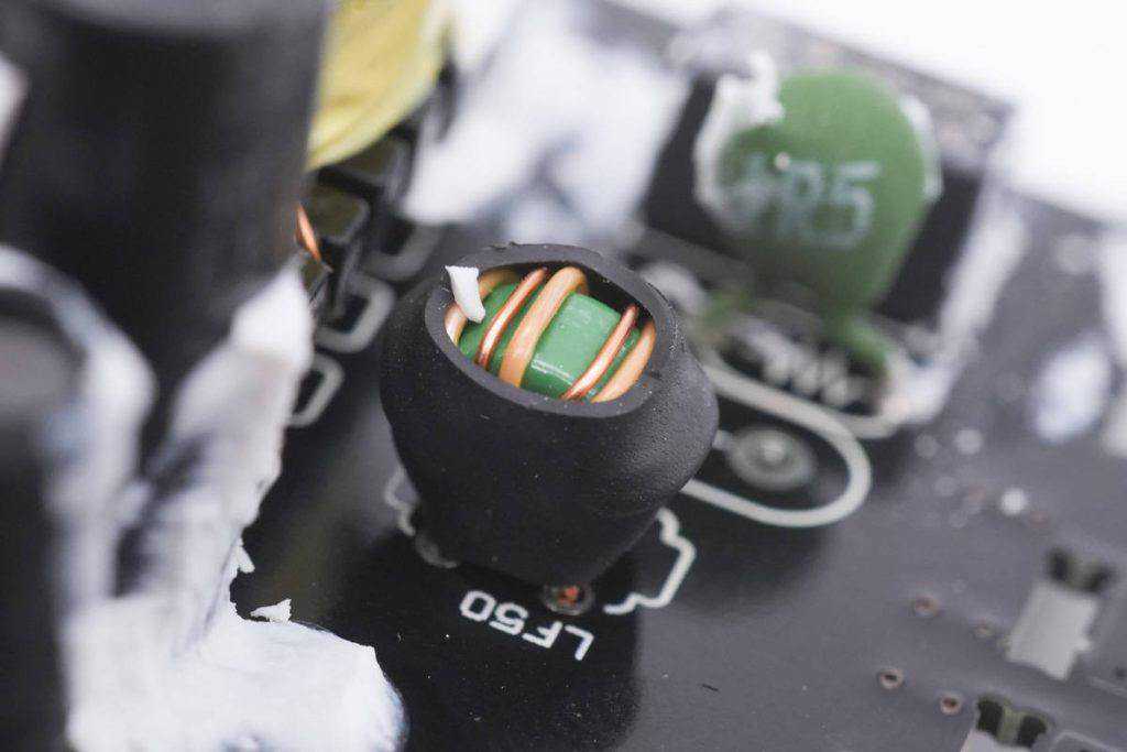 输出使用两颗400μF电容滤波,两颗电容之间是绿色差模电感。