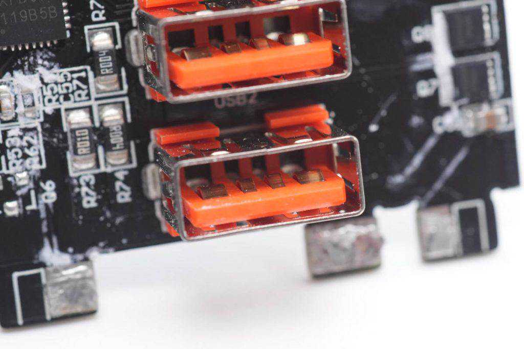 USB-C母座过孔焊接固定,橙色胶芯不露铜。