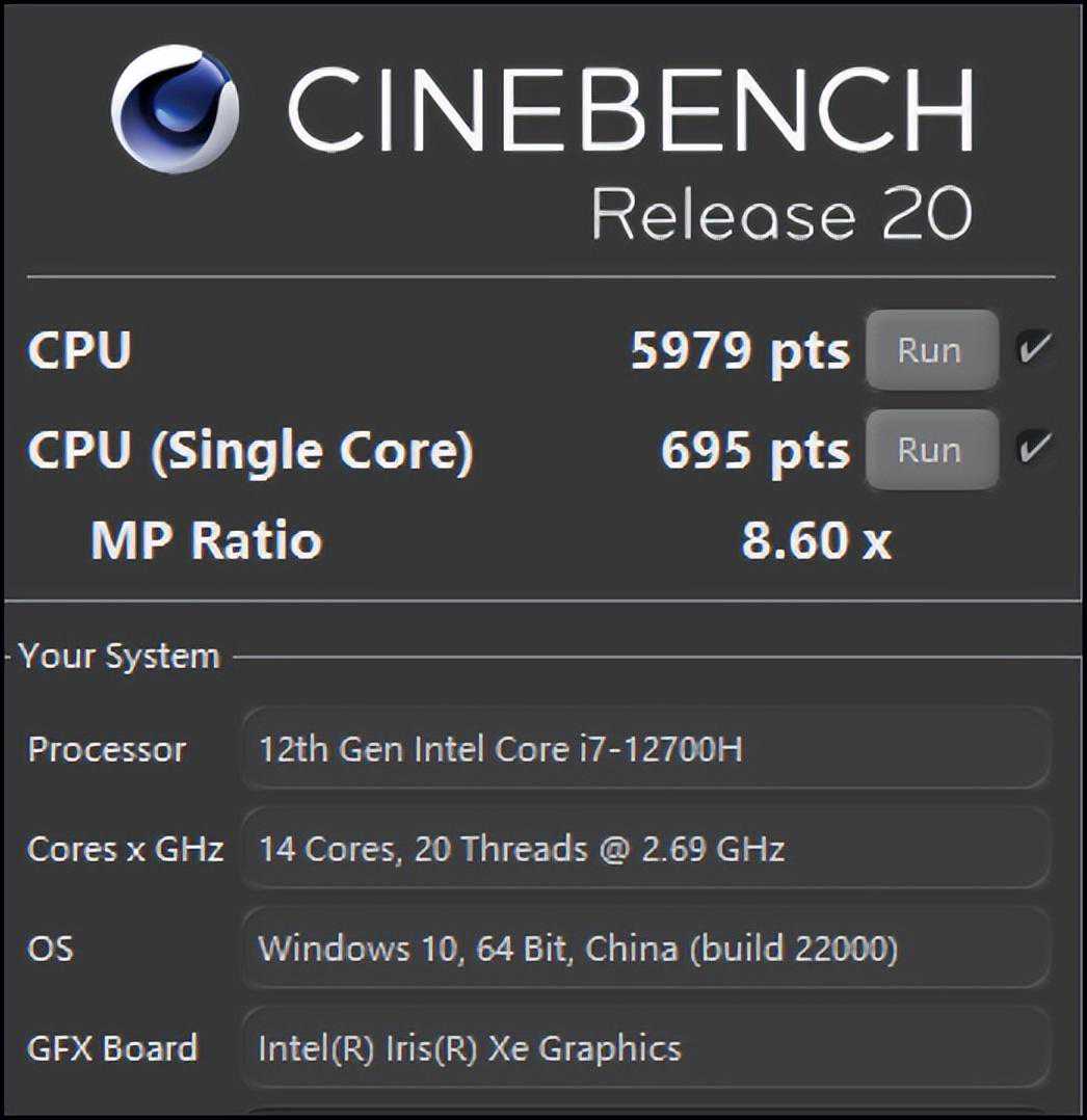 ▲CinebenchR20测试,灵耀Pro162022多核得分是5979pts,单核695pts。作为参考,65W的i712700H多核跑分6178pts,54W的锐龙76800H多核跑分是5074pts。