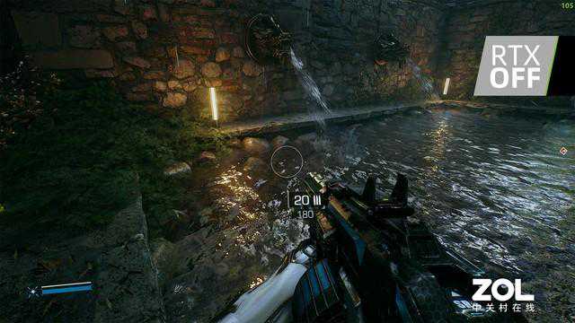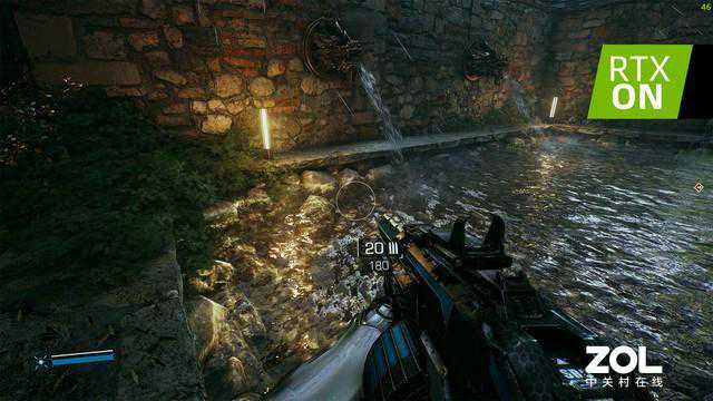 《光明记忆:无限》温泉场景中的光追效果是最为耗费显卡性能的。不难发现,最大的变化来自水中的倒影,而这一组倒影的计算难度非常高,由于并不是平静水面,所以要首先要考虑光线在水面的变化,其次与岸边鹅卵石的光线折射效果,最后则是综合前两种效果,将光线照射在水池底部。