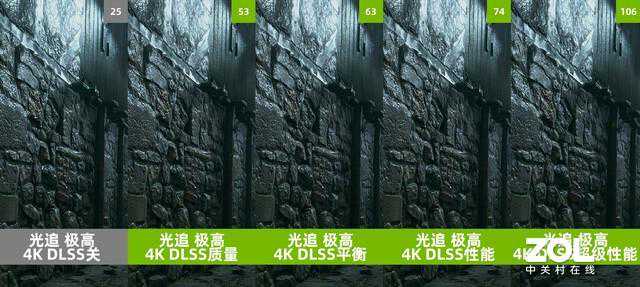 DLSS的对比测试中,首先还是《光明记忆:无限》在这一组对比中,在画面差距上,从DLSS关到DLSS性能依旧看不出什么变化,但是在超级性能模式中,墙壁的清晰度以及轮廓都有所下降。