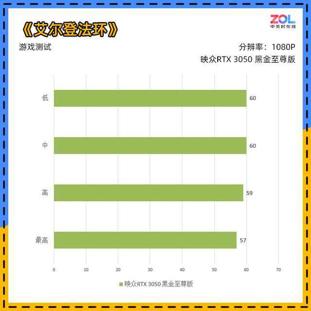 目前PC版的《艾尔登法环》依旧锁定60帧,所以再强悍的显卡也无法跑到更高帧数,根据我们的实测,映众RTX3050黑金至尊版在1080P中画质下,基本可以稳定60帧运行。