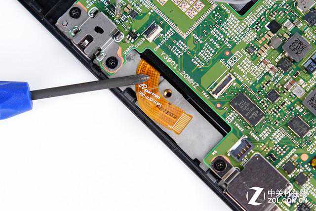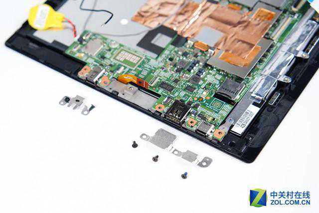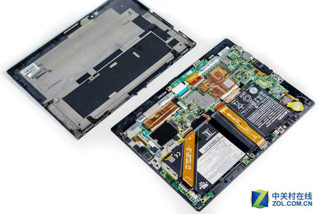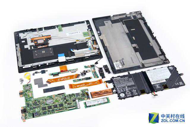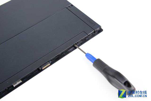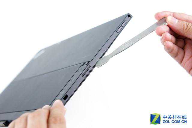 原本以为在外观上看不到任何固定螺丝的ThinkPadX1Tablet拆解难度会很大,好在它没有使用任何固定胶水来固定后盖,使得后盖的打开过程其实十分轻松,这也在一定程度上降低了售后的维修成本。