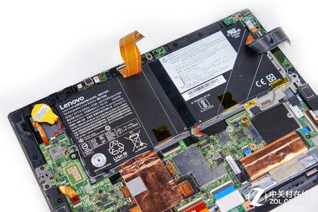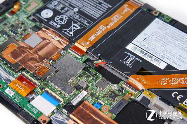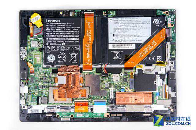可以看到取下后盖的ThinkPadX1Tablet内部近一半的空间都被电池所占据,整个内部空间的利用率相对较高,但还是有部分地方空缺,推测这些空缺位置为LTE高配版才配备的部件。其他地方的重要电子元件都有金属屏蔽罩保护,可以在一定程度上提升整机的运行稳定性。