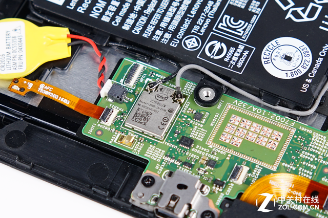 由于电池的周围固定着WiFi天线,所以在拆卸电池之前还需要把这里的天线拆下来。ThinkPadX1Tablet使用的是Intel的AC8260微型无线网卡,比传统笔记本电脑中的无线网卡要小很多,有利于在小尺寸的平板内部合理的安排空间分布。不过这块网卡是焊死在主板上的,可能会给后期的维修带来麻烦。