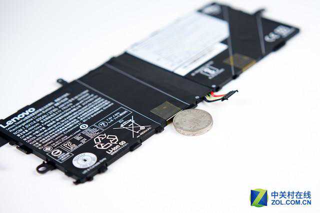 移除电池周围的所有排线后,再拧下电池旁的所有固定螺丝即可轻松的取下整块电池了。可以看到这块电池的厚度仅有两枚一元硬币那么厚,而它的容量却达到了37瓦时。