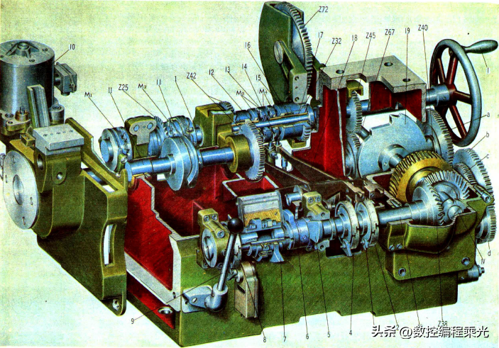 1.主轴21.15.轴承13.皮带轮8.时间轮2.弹簧夹头3.夹料锥套19.推管16.止推套17.滑套18.杠杆4.夹料凸轮6.圆螺母20.送料夹头11.送料管10.送料滑座8.杠杆7.凸轮
