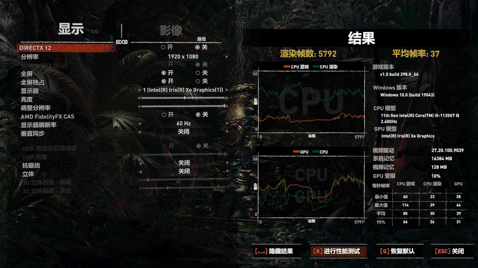 古墓丽影暗影跑分真是方便,其他游戏也学学人家呀。平均帧率37,比之前又涨了2帧,这核显还真是海绵里的水多,挤一挤总会有的。