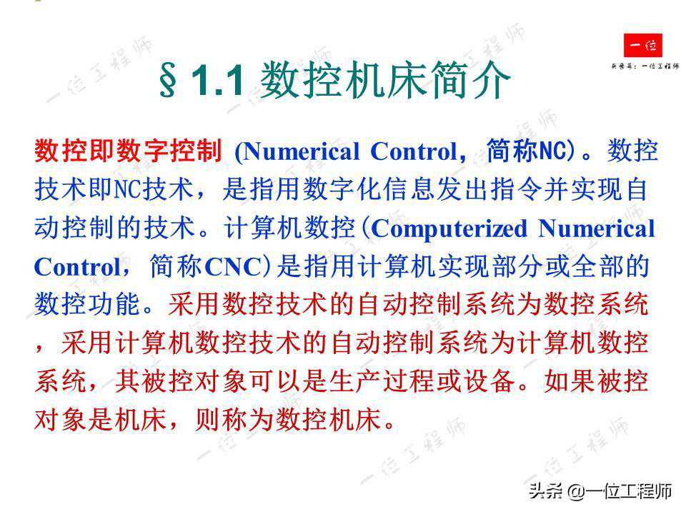 数控即数字控制,数控技术即NC技术,是指用数字化信息发出指令并实现自动控制的技术。计算机数控是指用计算机实现部分或全部的数控功能。采用数控技术的自动控制系统为数控系统,采用计算机数控技术的自动控制系统为计算机数控系统,其被控对象可以是生产过程或设备。如果被控对象是机床,则称为数控机床。