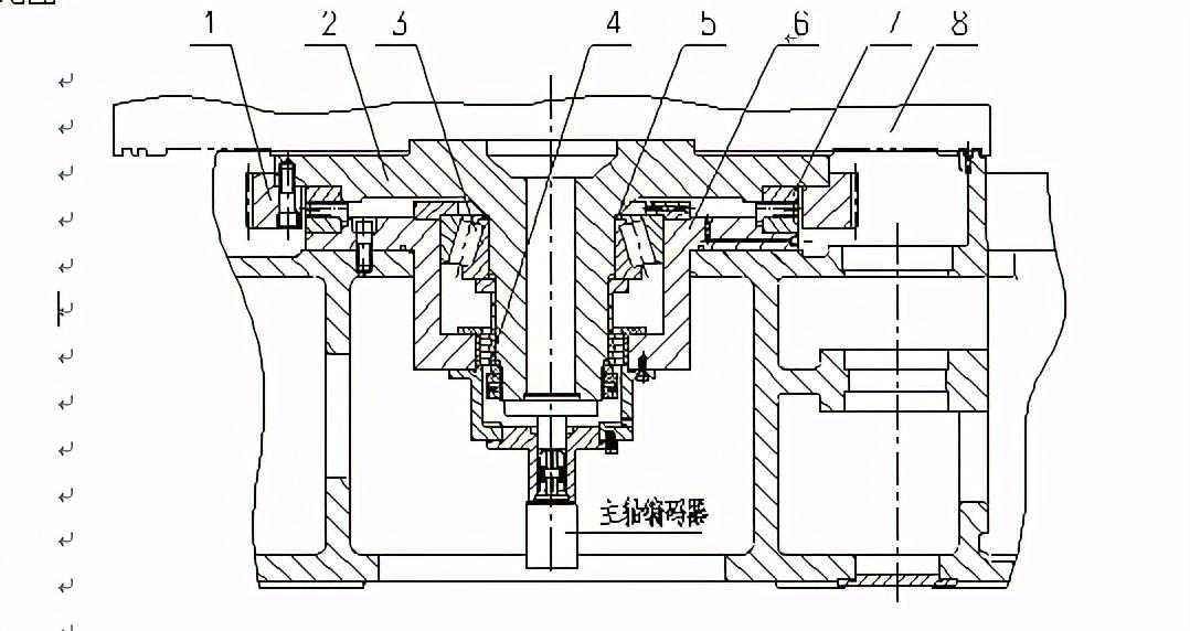需注意,调整垫5是用来做轴承预紧力的,它的厚度需在装配过程中使用工装来测量,具体的预紧力值需根据切削力、主轴最高转速等条件确定;主轴轴颈及轴承套内孔应在加工时按照一定的配合间隙与定心轴承的内外环的尺寸匹配加工;轴承套与机床底座的结合面需在刮研,保证两个结合表面的平面度及结合率且保证平面与主轴轴线的垂直度。同理主轴下端面及轴承座上端面与推力圆柱滚子轴承紧环和松环的结合面也需刮研。
