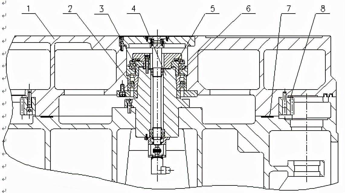 (1).将结构一中主轴拆分为过渡盘2及主轴5,此种结构便于主轴的加工及检测同时还便于装配时的找正及刮研;