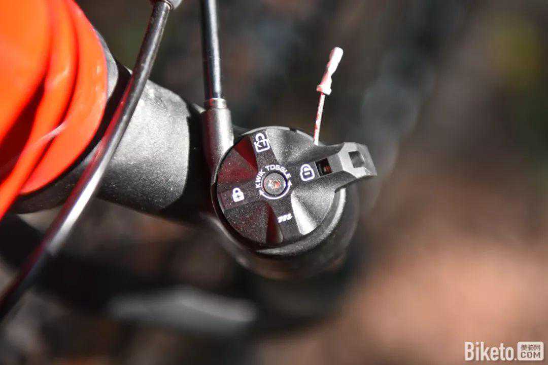 前叉线控器通过摁下银色拨杆锁定前叉,摁下白色方形按钮解锁避震打开行程做动。