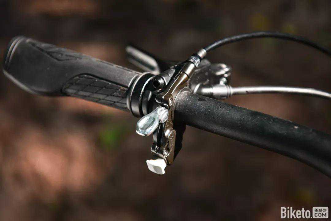 车把左右各两根线管,除了前后刹车以及后变速器的线管外,在原本前拨的位置上添加了前叉线控器,用于控制前叉的锁死和打开。