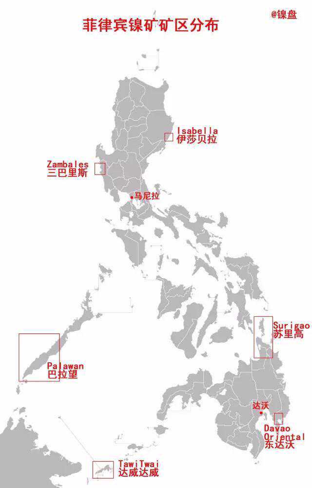 上图是我2015年重新绘制菲律宾镍矿区分布图。首先,北边是三巴里斯(闽南语翻译为:三描礼士)和伊莎贝拉矿区,伊莎贝拉矿区可以忽略不计。历史上,三巴里斯在印尼禁矿之前出货量比较大,光Benguet矿山能出200万吨中高镍。但印尼禁矿后发展并不好,菲律宾整体巨幅增长的大环境下却持续缩量,这里四个矿山上个出货季的出货量才一百多万吨,所以现在的量也不是很大。前段时间炒作的最先被禁的四个矿山就在这里。