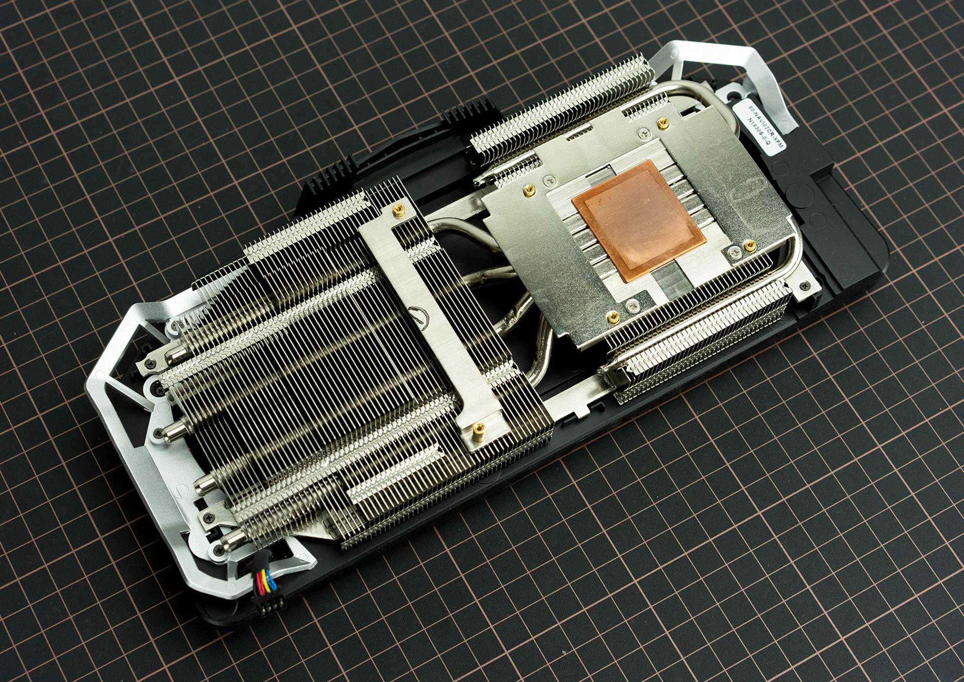 散热器配置方面,GPU散热底座采用纯铜直触材质,通过结合4根6mm热管将热量传导至散热鳍片上,热管和散热鳍片都有镀镍处理。