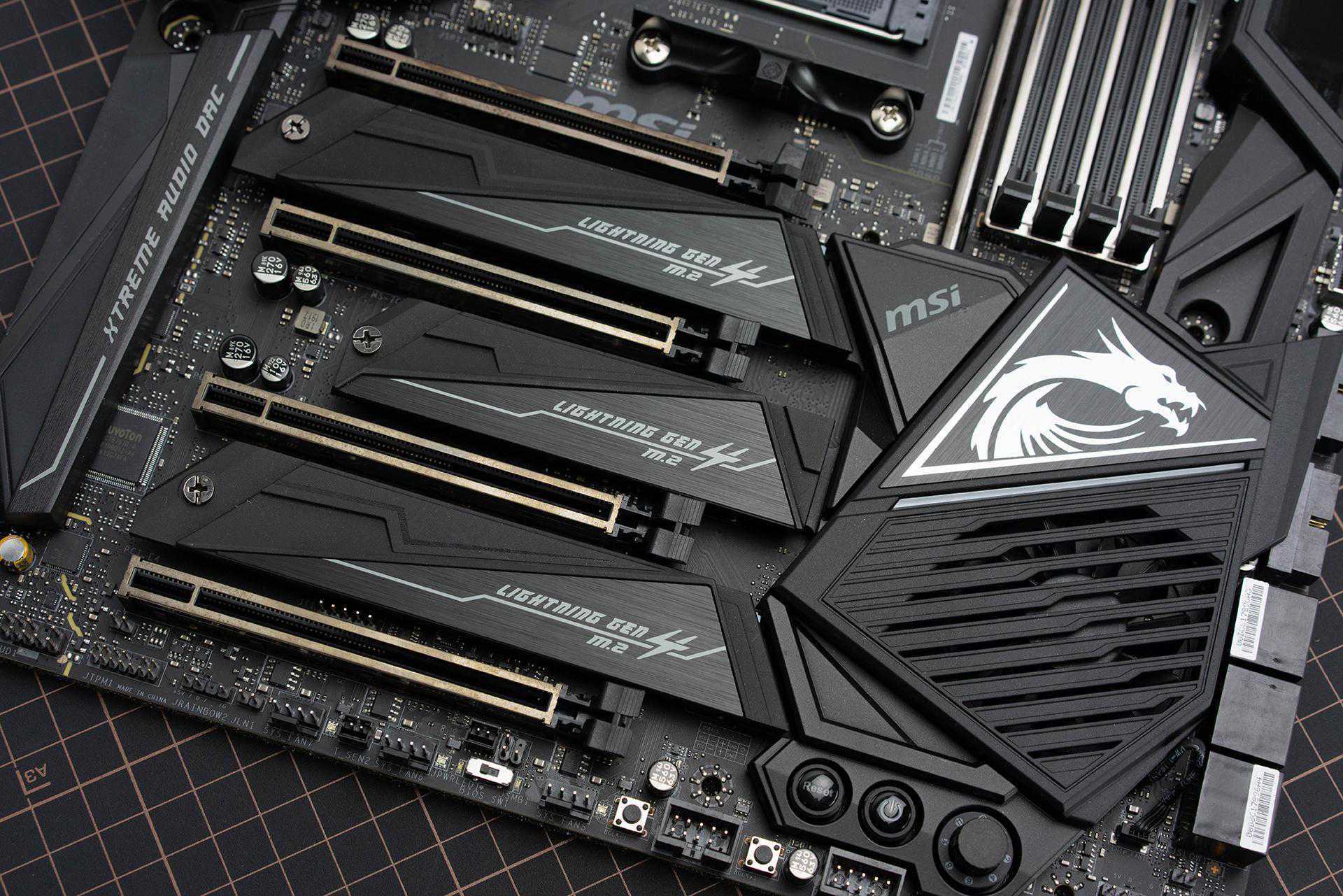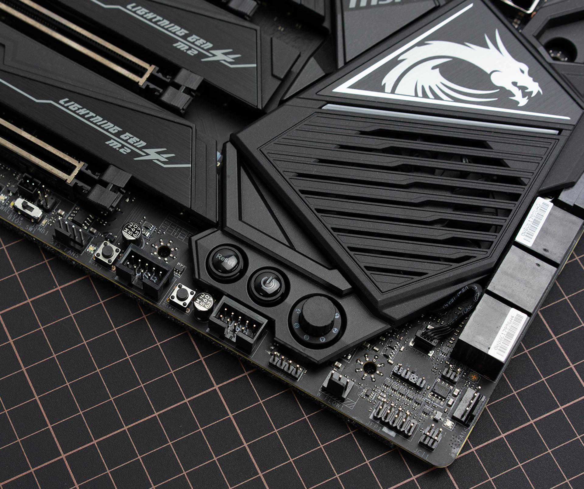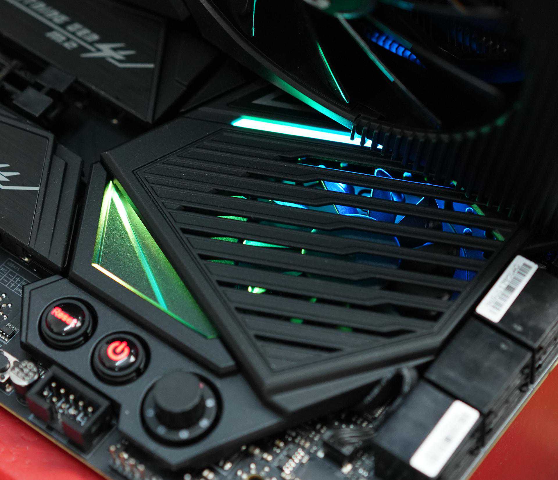 三路固态硬盘接口都配备了散热片,双层冰霜铠甲设计能对固态上下层热量都能很好散发,并通过造型设计将芯片组散热器的风量导入给接口阵列加强散热。